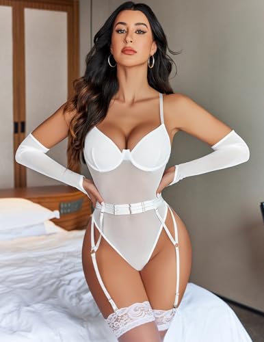 Sexy Lingerie for Women Mesh Teddy Lingerie with Garter Underwire Exotic Bodysuit(Including Oversleeves)